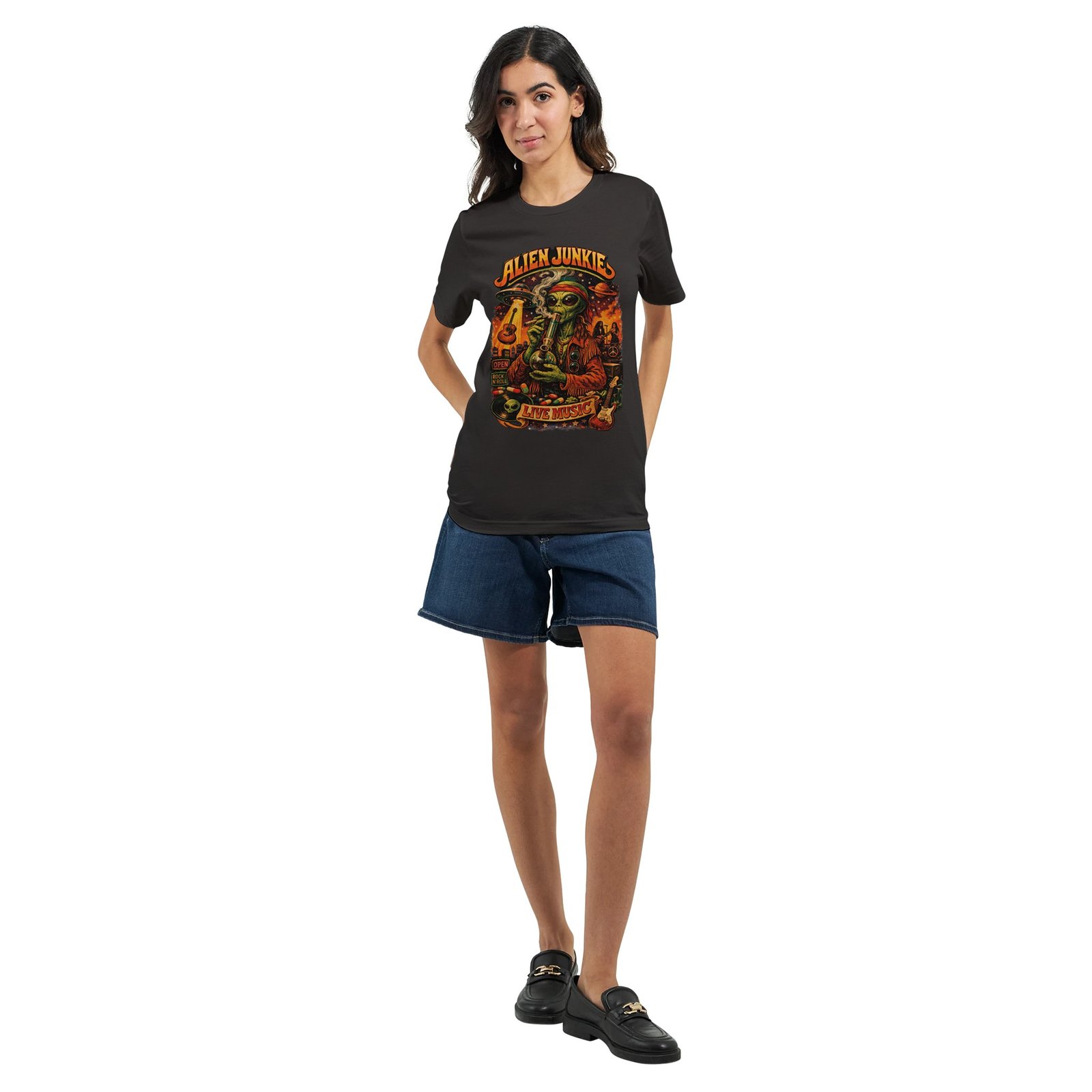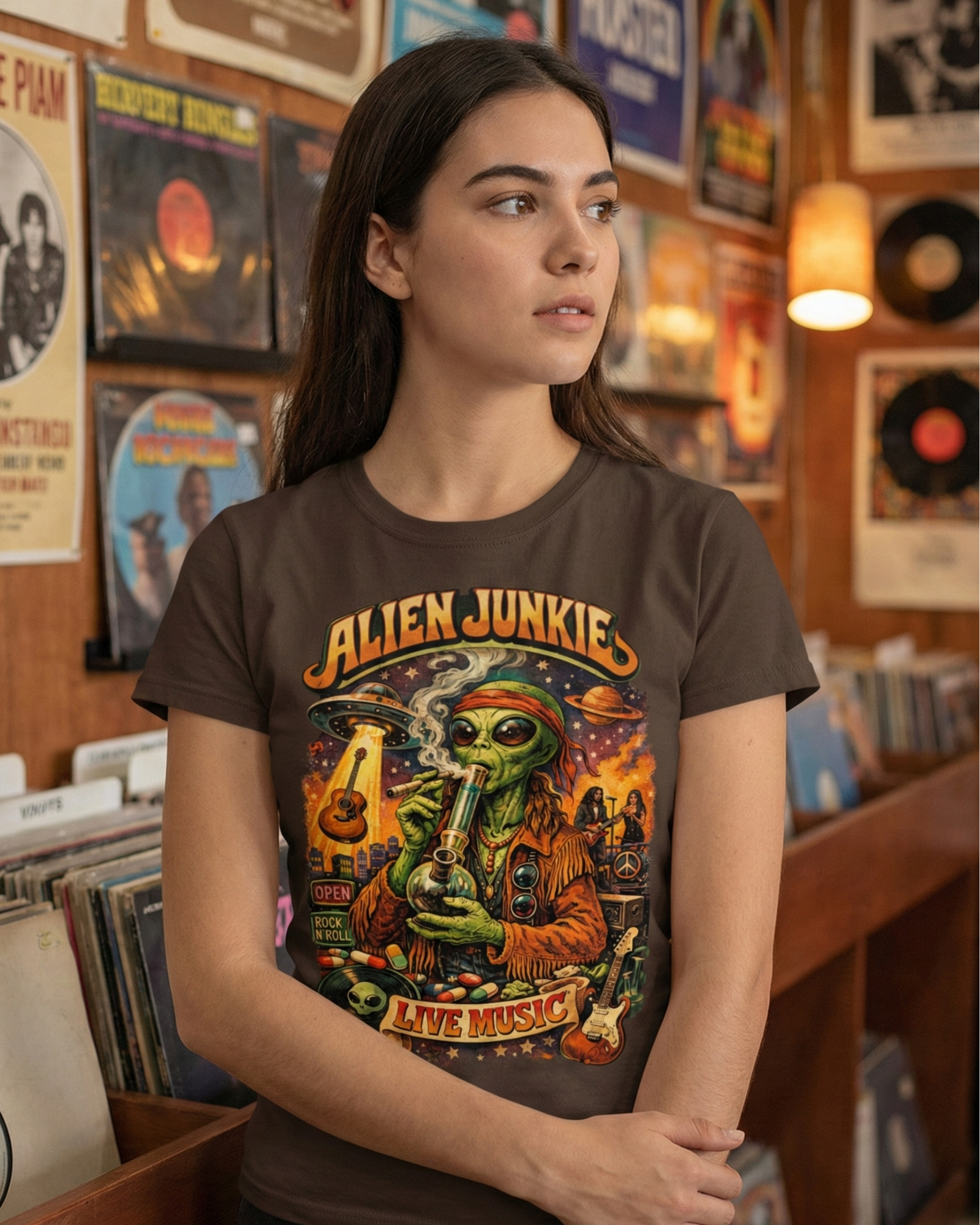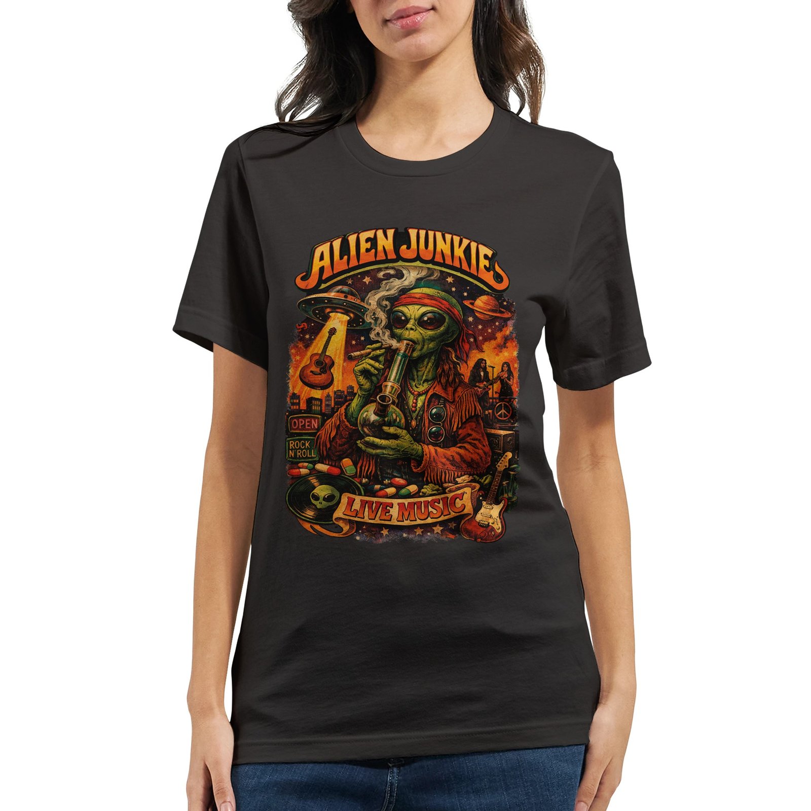 Step into the cosmos of style with our Alien Junkie Music T-Shirt! This unique tee showcases a whimsical alien enjoying live musicโa perfect blend of creativity and comfort for all fashion lovers from out of this world.